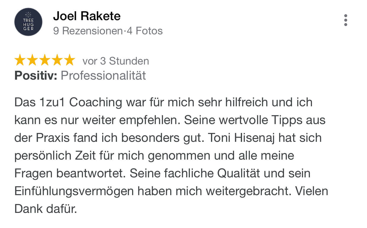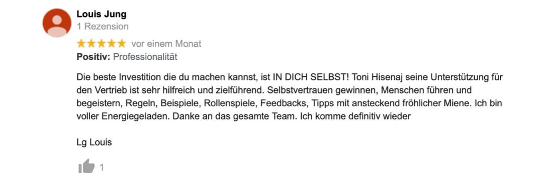 „Toni Hisenaj – das ist für mich die beste Mischung aus ganz viel Herz, sehr viel Erfahrung und Kompetenz, absoluter Ziel- und Lösungsfokussierung und Win-Win als Lebensmaxime. Alles garantiert mit viel Humor und Charme. Absolut empfehlenswert!“