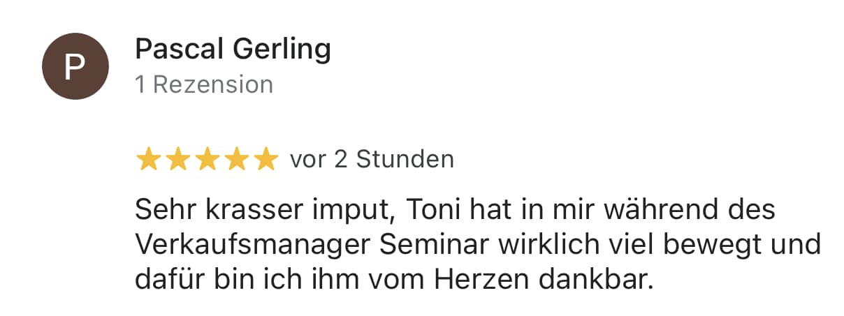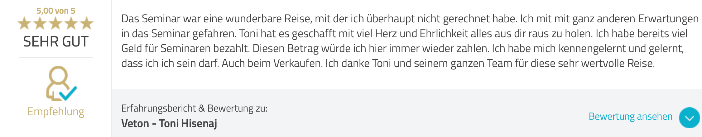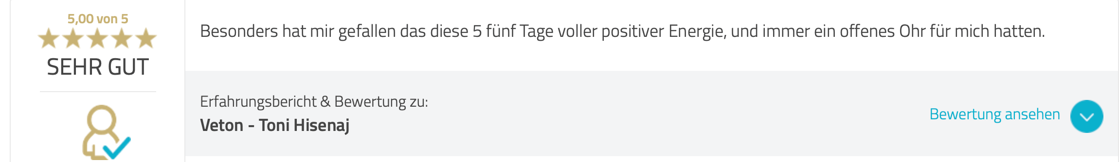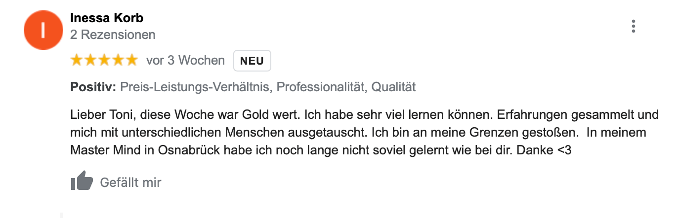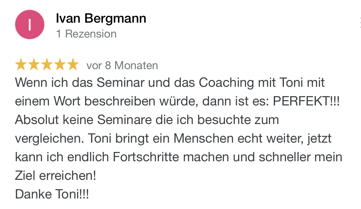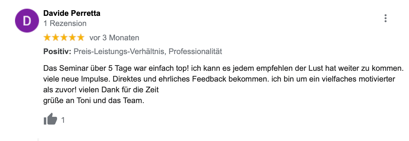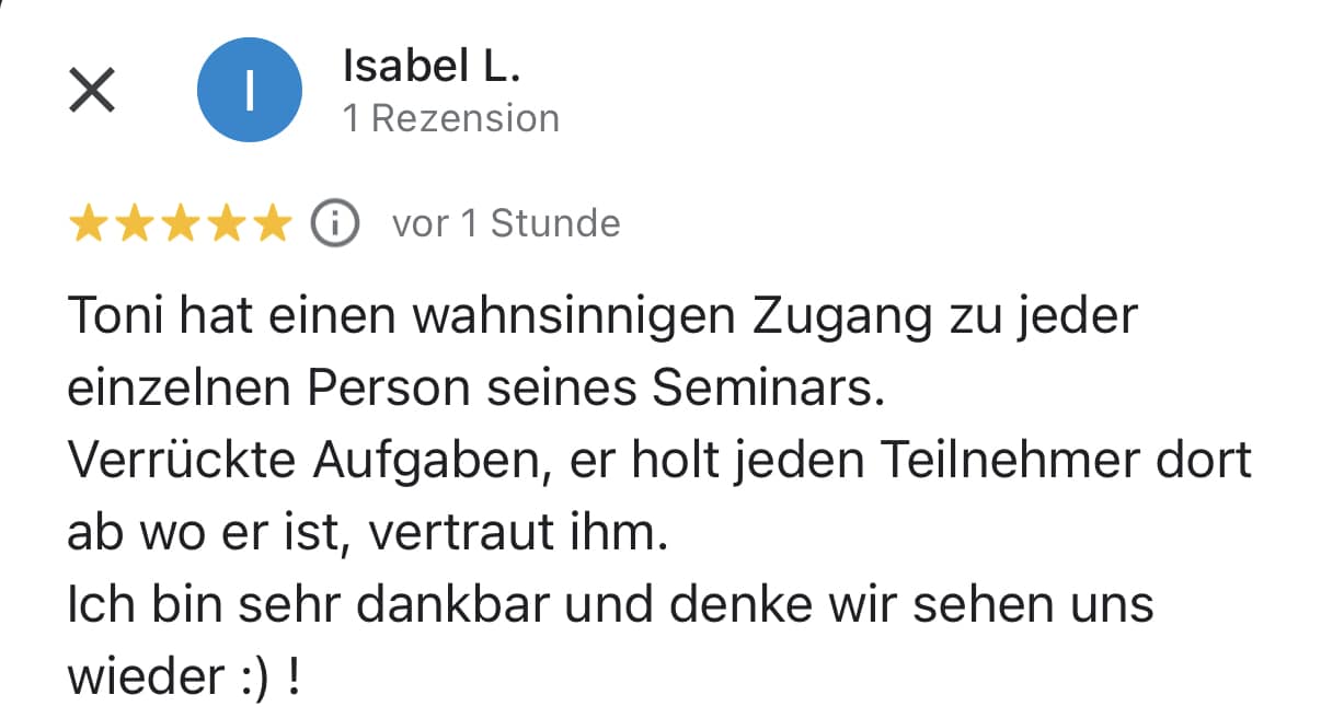„Ich bin 6 bis 7 Stunden gefahren. Das Seminar war eine emotionale Reise. Toni hat alles aus mir rausgeholt.Es lohnt sich auf jeden Fall.“